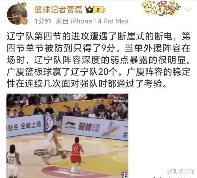 篮球记者贾磊在微博上感慨:“辽宁队在第四节的进攻仿若遭遇了急坠式的停滞,单节仅仅得到9分。在单外援阵容上场时,辽宁队阵容深度方面的短板尽显无遗。广厦队的篮板球数量比辽宁队多出20个。广厦队阵容的稳定性在数次对阵强队时都经受住了考验。”